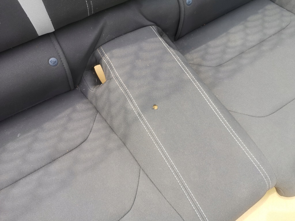 Die Sitzfläche hat ein Loch wie auf den Fotos zu sehen, ansonsten in sehr gutem Zustand, die Rückenlehne ist in einwandfreiem Zustand.