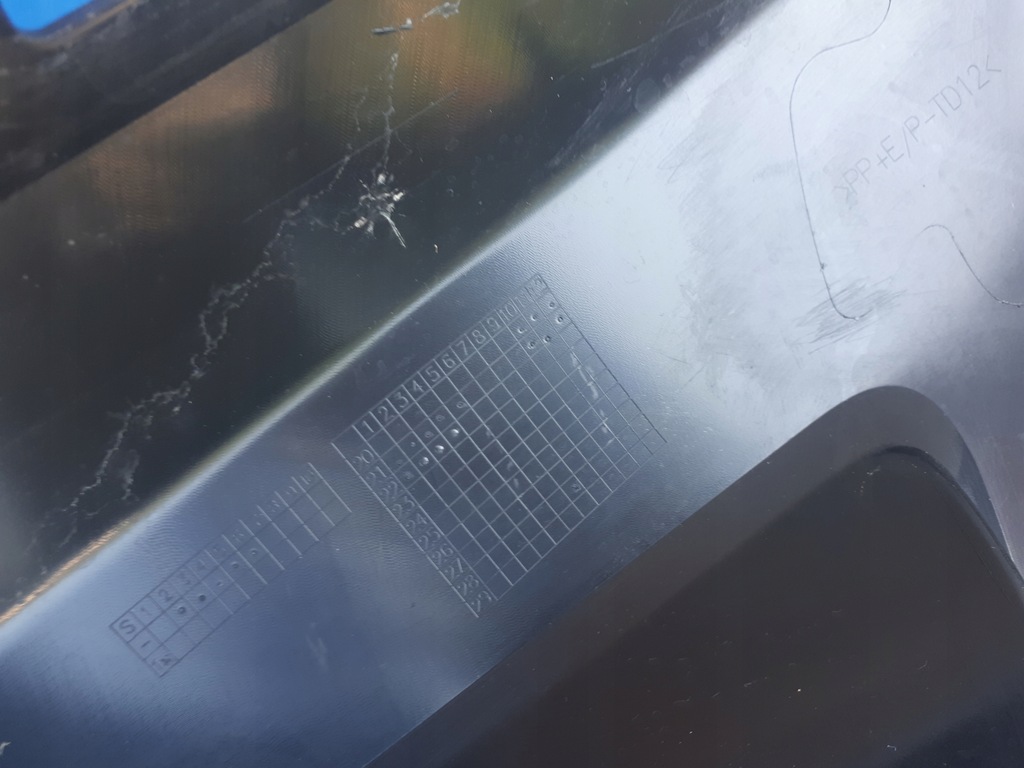 Stoßstange in gutem Zustand, eine Halterung beschädigt, auf dem Bild markiert. Sichtbare Kratzer und Schrammen.